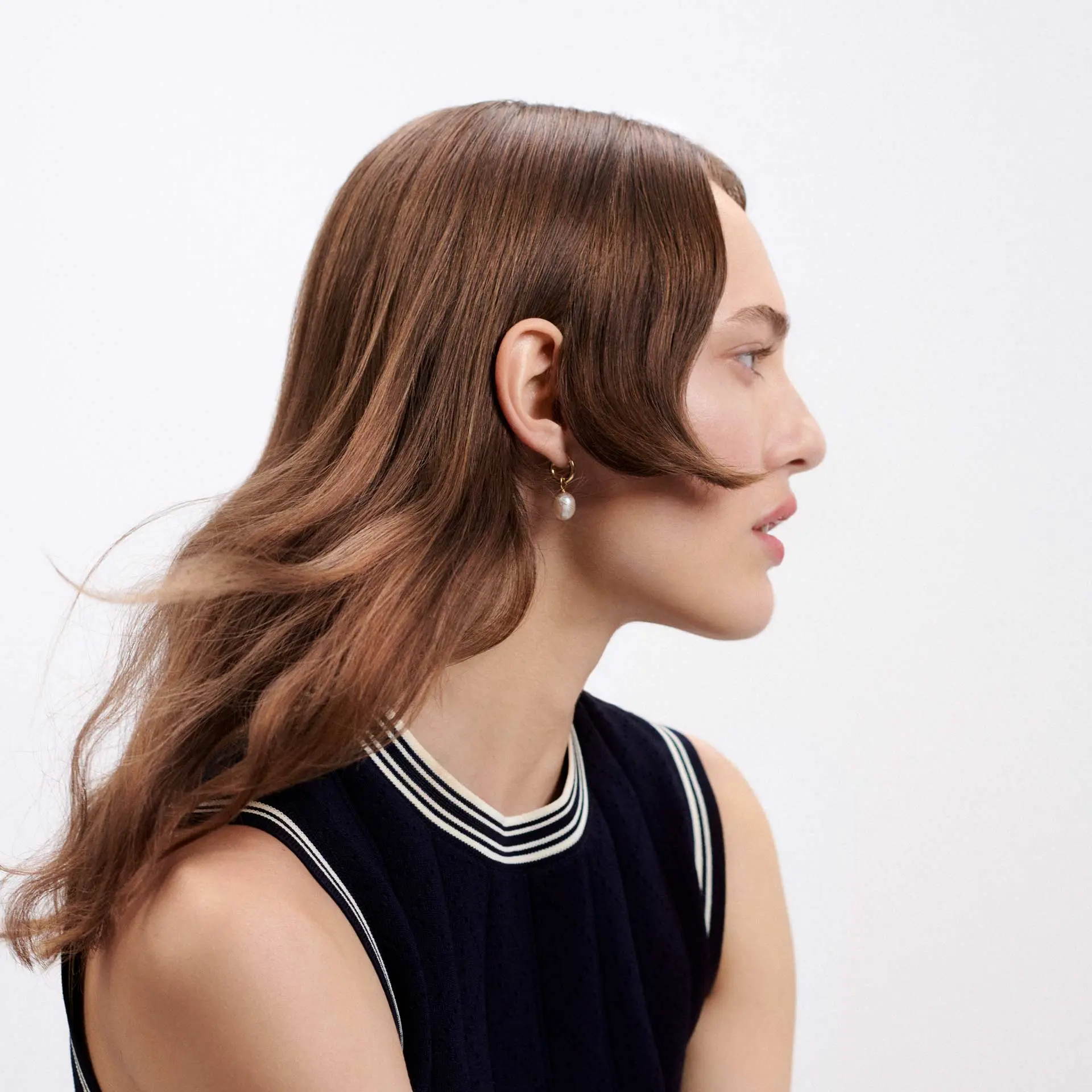 Die grafische Form der langen, unverbundenen Ponypartie bestimmt den Look. In der Day-Version mit soften Wellen, schwerelos definiert von Light Defining Cream, wirkt er unprätentiös und cool. Der warme, am Naturhaar orientierte Grundton der Haarfarbe, durch feine Strähnen und Slices subtil belebt, unterstützt die natürliche Anmutung des Stylings.